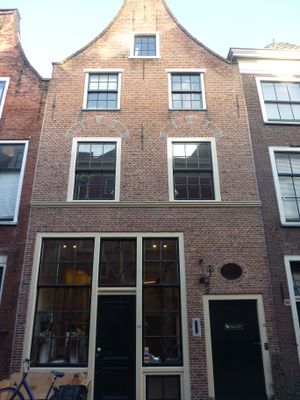 Pand met tuitgevel. Tudorbogen boven vensters op tweede verdieping, Rijksmonument op Langebrug 28, Leiden