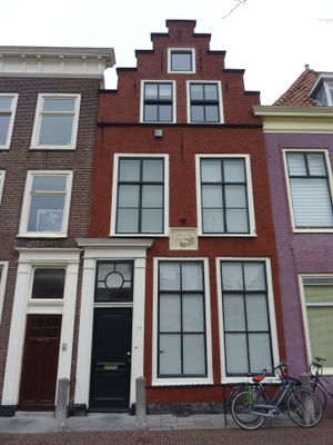 Pand met gepleisterde lijstgevel. Hoog zadeldak
