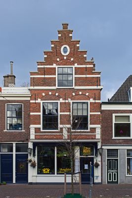 Pand met trapgevel versierd met natuurstenen banden, geprofileerde waterlijsten, geblokte ontlastingsbogen en in de top een cartouche-vormig blind oeil-de-boeuf, Rijksmonument op Verwersdijk 14-16