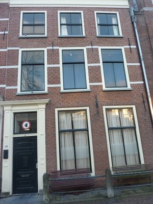 Pand met bakstenen gevel met rechte kroonlijst, deuromlijsting Lod. XV op metselwerk van verdieping resten van geverfde banden. Hardstenen stoep met palen, building in Leiden, Netherlands