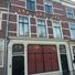 Pand met brede bakstenen gevel met rechte kroonlijst, fragment van oudere gevel met gemetselde bogen boven vensters van 1e verdieping. Op bovenmetselwerk resten van geverfde banden, building in Leiden, Netherlands