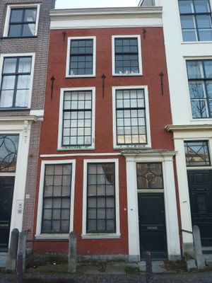 Pand met bakstenen gevel met rechte kroonlijst. Hardstenen stoep met palen, building in Leiden, Netherlands
