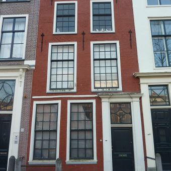 Pand met gepleisterde gevel en rechte daklijst. Schuiframen met kleine roedenverdeling en aan de benedenramen luiken. Hoekpand Rapenburg