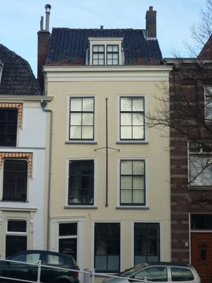Pand met gepleisterde gevel met rechte kroonlijst. Zadeldak, building in Leiden, Netherlands