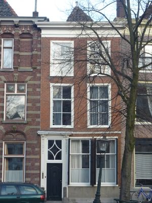 Pand met bakstenen lijstgevel. Lod. XIV deuromlijsting, goede pui. Hardstenen stoep en palen, building in Leiden, Netherlands