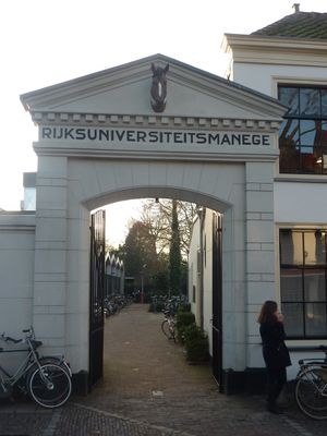Woning directeur Universiteitsmanega. Voormalige gebouw van het Statencollege in voormalig Cellebroederklooster. Poort met paardehoofd, alles gepleisterd