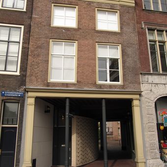Hoekpand Lombardbrug. Gevel met verkropte kroonlijst voor huis met twee parallel lopende zadeldaken evenwijdig aan de straat tussen puntgevels. Zakgoot. Achtergevel houtskelet