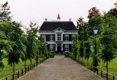 Herenhuis uit de eerste helft van de 19e eeuw, met dwars zadeldak en lijstgevel, ingang met versierd bovenlicht, hoofdgestel met guirlande en voluutvormige consoles