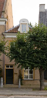 Huis met zadeldak, kroonlijst op klossen, ramen met waaierzwikken