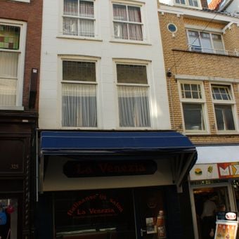 Pand met in natuursteen-imitatie gepleisterde lijstgevel en flauw getoogde vensters, Rijksmonument op Voorstraat 323