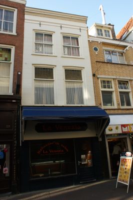 Hoekpand Vriesestraatsteiger met hoog schilddak waarin dakvenster; gepleisterde voorgevel met decoratie. Puntgevel aan de Voorstraatshaven