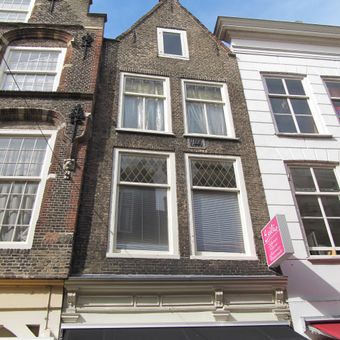 Pand met gepleisterde lijstgevel, aan de Voorstraathaven puntgevel met vlechtingen
