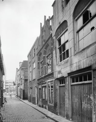 Hoekpand Ruitensteiger met eenvoudige lijstgevel, lijst verkropt. Gevel aan de Voorstraatshaven gepleisterd