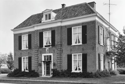 In park gelegen herenhuis met verdieping en omlopend schilddak. Deur met bovenlicht en in de parterre vensters met zesruitsschuiframen
