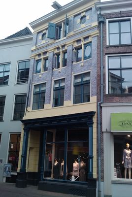 De Rozijnenkorf. Huis met rijk van beeldhouwwerk voorziene halsgevel. Winkelpui uit 1900. Na een grote brand in 2002 geheel gerenoveerd