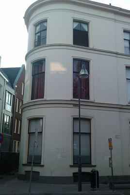 Pand, dat het linker gedeelte van de afrondende rechter hoek vormt van een in het derde kwart van de 19e eeuw als een symmetrisch geheel ontworpen straatwand