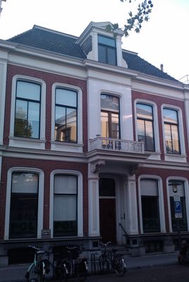 Pand, dat het linker gedeelte van de afrondende rechter hoek vormt van een in het derde kwart van de 19e eeuw als een symmetrisch geheel ontworpen straatwand