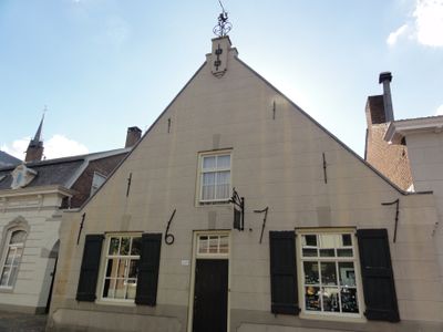 Onderkelderd, gepleisterd pand onder pannen zadeldak, tussen puntgevels met toppilasters