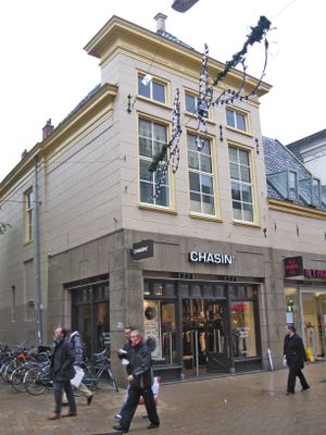 Diep pand met verhoogde voorgevel, Rijksmonument op Herestraat 40 en Hoogstraat 3