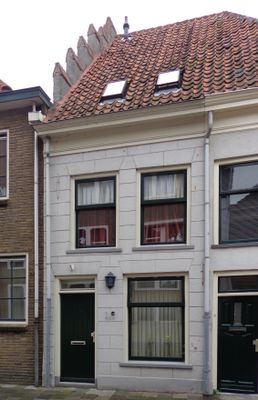 Huis met lijstgevel met gepleisterde pui, gevelsteen en dakkapel
