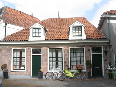 Hoekpand met gepleisterde lijstgevels met smalle gevel aan de Veenestraat en zijgevel aan de Burgwal onder langgerekt schilddak