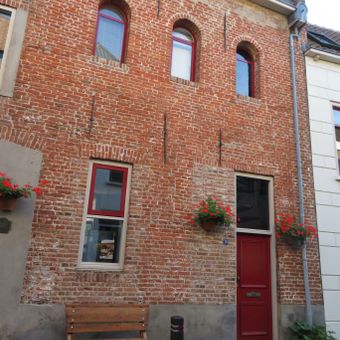 Eenvoudig pandje onder schilddak, samen met nr. 20 oorspr. deel van het "Suete Name Jhesushuys", Rijksmonument op Hofstraat 18