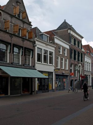 Pand met geverfde lijstgevel en jongere winkelpui, Rijksmonument op Oudestraat 29