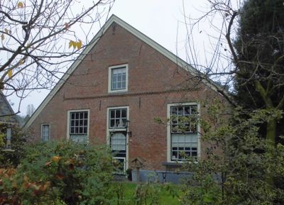 Boerderij met topgevel, rieten dak. Kleine roeden versierde deuromlijsting. Opzij schuiframen met halve luiken