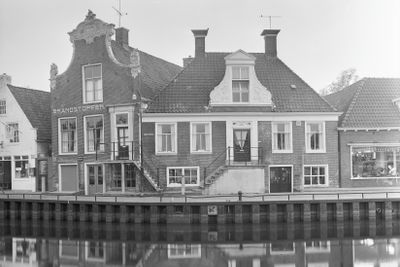 Woonhuis onder zadeldak tegen klokgevel met gesneden deur en bovenlicht, zwierige aanzetkrullen en groot kuifstuk in de plaatselijke Friese trant van de 18e eeuw