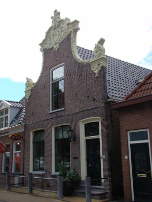 Woonhuis onder zadeldak tegen klokgevel met gesneden deur en bovenlicht, zwierige aanzetkrullen en groot kuifstuk in de plaatselijke Friese trant van de 18e eeuw
