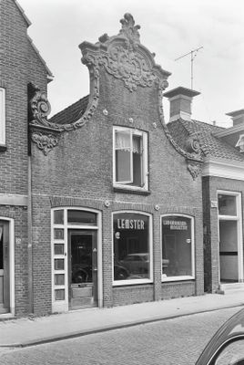 Pand onder zadeldak tegen met beeldhouwwerk in de plaatselijke trant der late 18e eeuw versierde klokgevel, Rijksmonument op Nieuwburen 24