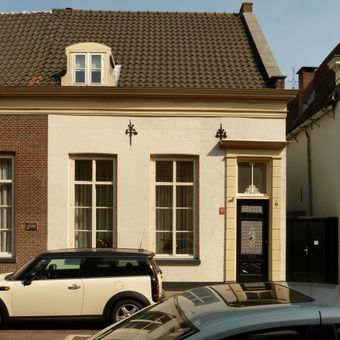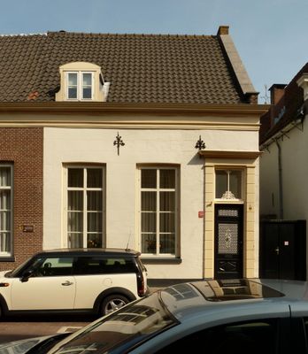Gaaf bewaard, deftig herenhuis met verdieping en dwars schilddak, waarop hoekschoorstenen met kappen