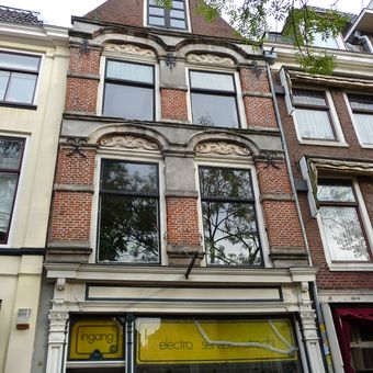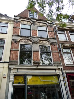 Pand met gepleisterde gevel met moderne verhoging aan de Oudegracht gelegen