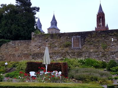 Stadsmuur in kloostertuin Zusters Onder de Bogen, rijksmonumentaal beschermd onderdeel van de eerste middeleeuwse stadsmuur in Maastricht, Nederland