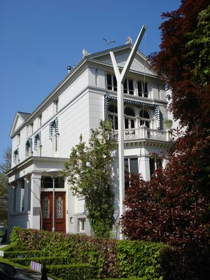 Villa. Gepleisterde gevel met getoogde en rechthoekige vensters, driezijdig uitgebouwde erker met balconhek en bekronend fronton, Rijksmonument op Westersingel 101