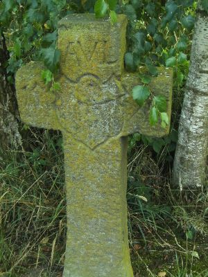 Natuurstenen ongevalskruis met de letters AVL, een wapenschild en het jaartal 1570