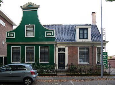 Houten huis, voorzien van een ingezwenkt voorschot met pilasters en fronton