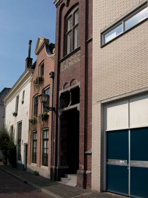 Pand met bakstenen lijstgevel met grote ramen en gepleisterde omlijste voordeur