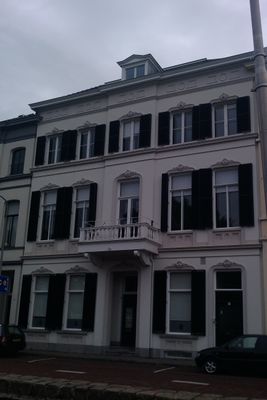 Statig herenhuis met schilddak en gepleisterde lijstgevel met stucwerk en balcon