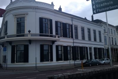 Pand met afgeronde hoek, onder een doorlopende kroonlijst met ijsselkade 12