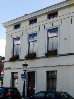 Pand, gevel met rechte kroonlijst, hardstenen frontons boven de ramen, ingang met natuurstenen omlijsting en door fronton gedekt, fraai gebeeldhouwde deur