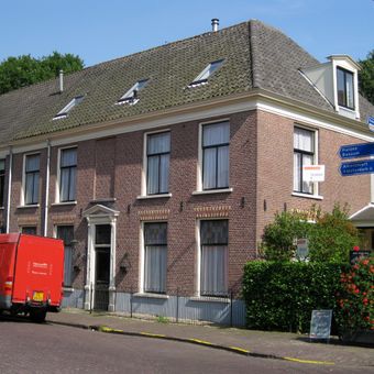Pand met gepleisterde topgevel onder zadeldak, met ernaast gelegen depot van de Weeshuiskazerne waarvan zadeldak in topgevels eindigend