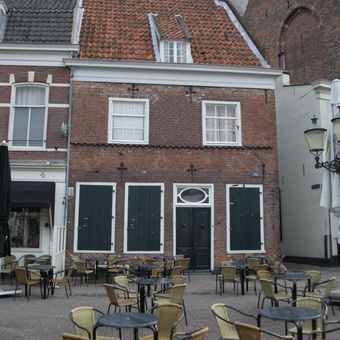 Woon- en pakhuis met gepleisterde topgevel; tegen de St. Joriskerk gebouwd