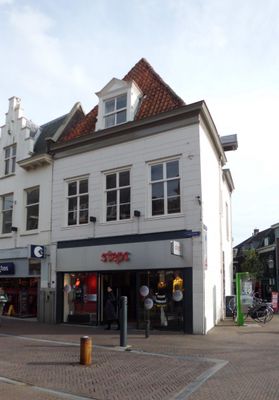 Pand met hoog tentdak, door winkel aangetast. Aan achterzijde en zijkant oude staat het beste afleesbaar