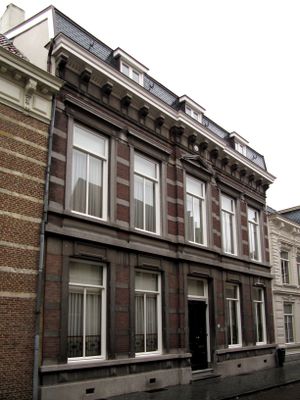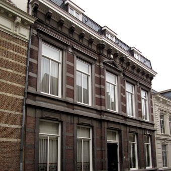 Herenhuis met in de gevel overvloedige toepassing van hardsteen voor waterlijsten, versiering boven de vensters en middenfronton in de verdieping