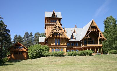 Villa Fridheim beslaat 1000 vierkante meter verdeeld over meerdere verdiepingen, met grote boogvensters en een 30 meter hoge toren aan de zuidwestzijde.