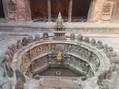 Het stenen bad toont gesneden idolen van Ashta Matrikas, acht Bhairavs en Nagas op de muren, met vergulde koperen uitlopen die de godheden Vishnu en Laxmi weergeven.