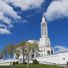 De achthoekige kerkstructuur rijst 78 meter hoog met een beeld van de Maagd Maria op de top en talrijke glas-in-loodramen.