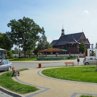 De houten Sint-Adalbertkerk uit de jaren 1757 en 1758 toont barokke interieurelementen en middeleeuwse beelden van de Maagd Maria en Sint Jan binnen. Bezoekers kunnen de verbinding volgen tussen de oorspronkelijke religieuze architectuur van het gehucht en latere artistieke toevoegingen.