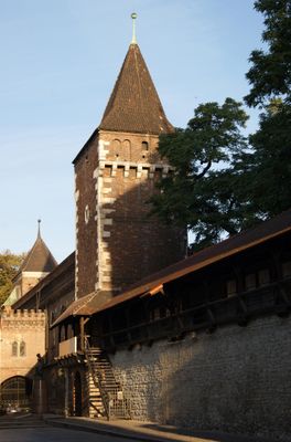 De Timmerstoren is een stenen verdedigingswerk met spitsbogen en gerekte tongewelven, typisch voor middeleeuwse militaire architectuur. Het maakt deel uit van het stadsversterkingssysteem van Krakau en toont de bouwmethoden van die tijd.